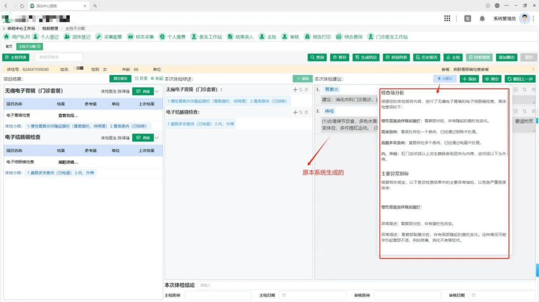 基于体检过程中各类检查设备获取的数据,如影像、检验结果,客户历年报告等,结合 AI 智能诊断技术,系统可自动生成结构规范、内容详实准确的体检报告。报告不仅清晰呈现体检结果,还能针对异常指标提供详细的分析解读和专业建议。这极大地提升了体检报告的规范性和可读性,显著提高医生撰写和审核报告的效率,让受检者更快获取体检结果,减少等待时间。