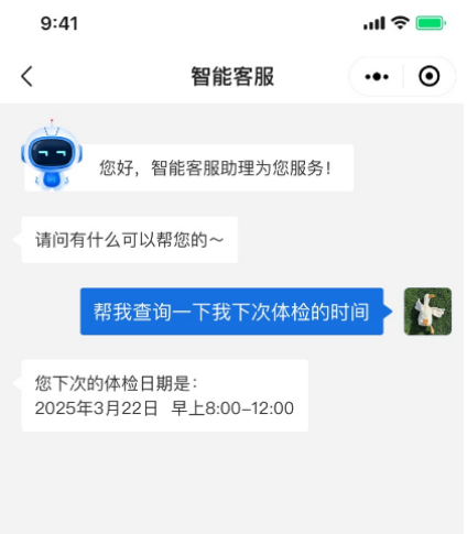 提供全年无休、毫秒级实时响应的智能客服服务。受检者可随时咨询体检预约、报告查询、体检注意事项等高频问题,智能客服精准解答,使受检者的服务体验效率提升 85%,有效缓解受检者在体检过程中的疑惑和焦虑。